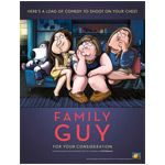 Those crazy, irreverent kids on FOX TV’s Family Guy team have done it again. Once again celebrating its yearly tradition of going to great lengths to outrage/amuse Emmy Awards voters, a new For Your Consideration ad for Seth MacFarlane’s breakout toon sitcom shows the Quahog crew (Peter, Quagmire, Brian and Joe) mimicking the promo image of four girls on a couch used for Lena Dunham’s HBO comedy Girls–as usual, accompanied by a (delightfully?) tasteless tag line unsuitable for the kiddies, EW posted.