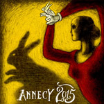 “First of all, the poster is paying tribute to animation: the hands, wearing old gloves from the days of the first cartoons, are making shadow puppets, one of the first shapes ever projected and as old as mankind itself. This rabbit shadow puppet is my tribute to the Annecy Festival public. After 20 years of regular visits to the Festival, I’ve heard this unique and very enthusiastic chant from the public of ‘Le lapin… Le lapin!” many times. The hands that are making the shadow puppets are a woman’s. She is the main element of the poster because Annecy 2015 is dedicated to women. This woman, dressed in red against a yellow background, is a flamenco dancer… because this year’s guest country is my neighbour, Spain.”