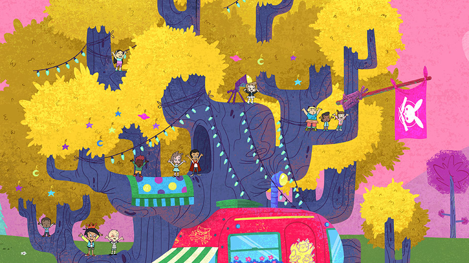 For the show’s visuals, the creative team opted for visuals that reflected the “Saturday afternoon” feeling and mood of childhood. “We wanted it to look modern, but have a throwback quality to it as well,” says Theofilopoulos. “I had worked on Disney’s Mickey show and thought that Paul Rudish and company had done such a great job with it. So, we brought in Peter Emmerich as art director, and we were very much inspired by Yogi Bear cartoons and paintings from that era.” Theofilopoulos and the art team used different color palettes to suit the modern sensibility of the show.