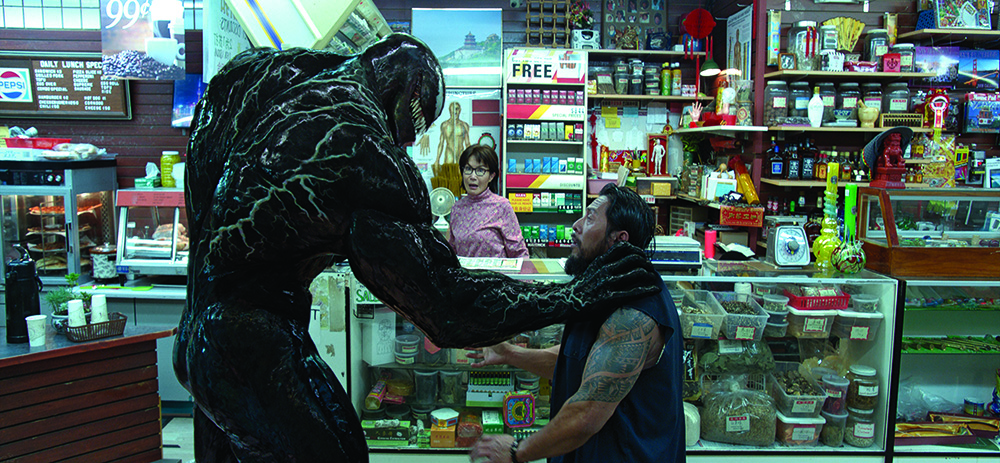 In this much-anticipated film, an alien parasite inhabits the body of investigative journalist Eddie Brock (Tom Hardy), which leads to a battle of wills between them. “There are two different forms of Venom,” explains Franklin. “There’s the symbiote, which is an oily, gelatinous, slug-like amorphous creature that has no skeleton that is a constantly changing shape and swashing around before bonding with the host. After the bonding takes place, he produces this thick, rubbery exoskeleton that emerges out of the skin of Eddie Brock and transforms him into Venom, which is a large, physically muscular character.”