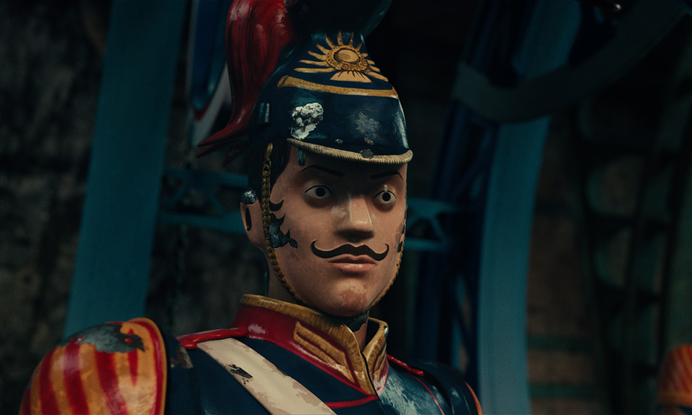 The Mother Ginger marionette is a giant puppet, designed by the art department to be a menacing 40 feet tall and 30 feet wide, with a circus tent for a skirt. In several shots there is a huge practical Mother Ginger puppet skirt, torso and head, but for most scenes she is a full CG character, built to perfectly emulate the practical build used while shooting. For shots where the puppet is practical, she was enhanced with CG steam, arms and mouth. The most complex challenge was designing her mechanics to work for a battle scene where she is attacked by an enormous army of seven-foot-tall tin soldiers that swarm around her.