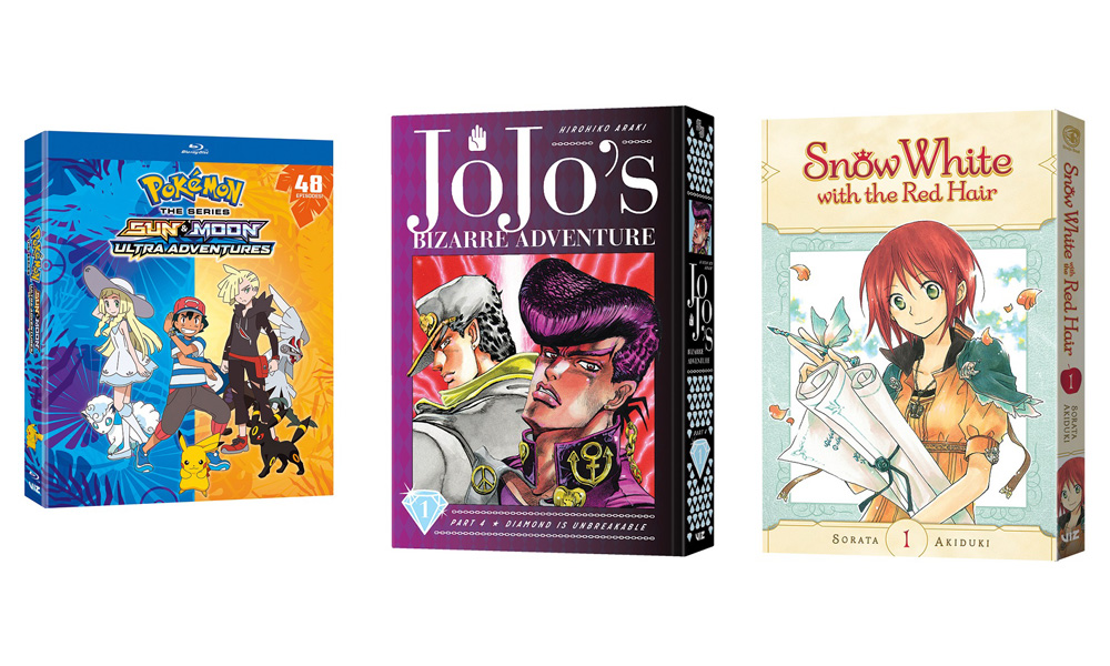 VIZ Media announces three new home media and manga titles coming up next month — plenty to keep otaku hearts in bloom through the end of spring! On disc, trainers can catch Pokémon the Series: Sun & Moon – Ultra Adventures Complete Collection, which collects all 48 episodes across six discs on Blu-ray and DVD. In print, JoJo’s Bizarre Adventure: Part 4 – Diamond Is Unbreakable delivers the latest saga of Hirohiko Araki’s award-winning, multigenerational action-adventure to readers; meanwhile, shojo fans can check out a new series with Snow White with the Red Hair.