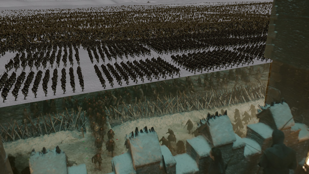“Once the Night King arrives and a big tendril storm comes in, it’s like a dense cloud,” says Hill. “That was great because we could use that for projecting shadows up onto which made for a nice and effective graphic of the dragon approaching. We used Eddy to have mist travel through the frame. For the sake of flexibility, we automatically rendered three or four fluid or snow simulations in the general direction of the wind. So, when starting a shot, compositors could see which one worked best and drop that straight in. It would be a 3D simulation so you could see it go through all of the Massive armies. Where we used Shadow Sling [a proprietary deep compositing tool] was in terms of the interactive lighting because up to that point we hadn’t actually lit the volumes. If the dragon fire or the position of the moon moved at all, we could re-shadow and relight these volumes in deep compositing inside of Nuke.”