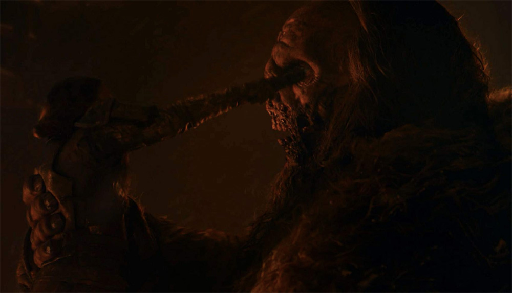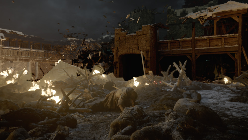 A David and Goliath confrontation takes place when tiny Lyanna Mormont stabs the wight giant Crum in the eye as she is being crushed to death in his hands. “We were planning to use the plates of Lyana and Crum and composite them together,” reveals Hill. “But when putting them together we wanted to make this more visceral and shocking for the audience. We replaced Lyana with a CG body and replaced Crum’s hand with a CG hand so we could crush Lyana’s body and composite elements of blood coming out of her mouth. Lyana gets her own back by stabbing Crum in the eye, and he disintegrates. We essentially created a model and simulation of Crum’s clothes, hair, skin, tissue, fascia, muscle and bone, and did a multilevel disintegration that was projected onto the plate and relit it as he fell apart.”