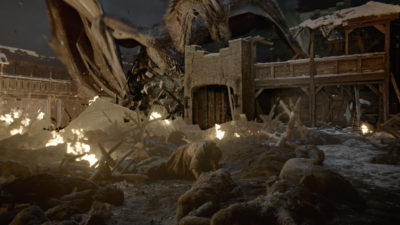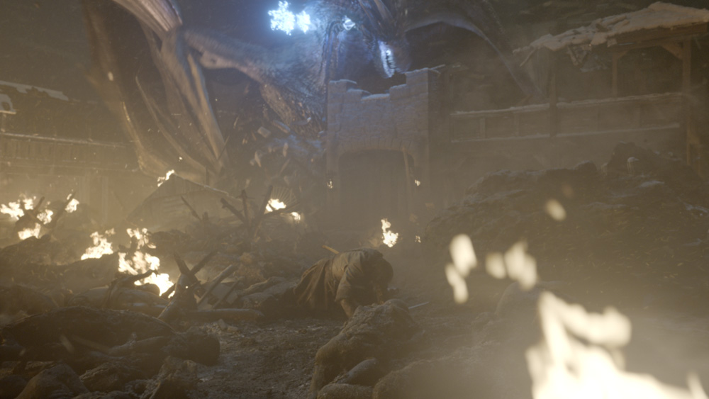 Hill adds, “One of the exciting things was the diversity of work. There were a lot of bespoke shots throughout. My favorite scenes are either the courtyard of Winterfell being smashed up by Viserion before the death of the Night King, or Rhaegal’s death.”