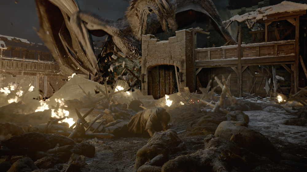 Of course, fans of the show know and expect a certain dragon fire methodology from the series. As Hill explains, “They have a motion-control flamethrower and the shots are preplanned, which allows for the position of the fire to be mapped; that was terrific because it gave us a baseline of what the fire should look like.”
