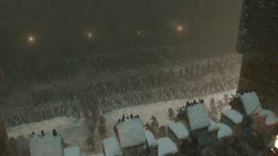 A deliberate effort was made by director Miguel Sapochnik and cinematographer Fabian Wagner to elevate the presence of shadows in the night-time environment to obscure parts of the frame in Winterfell battle episode “The Long Night” (Ep. 3).