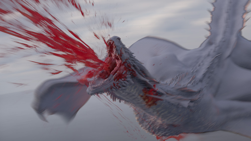 Maintaining damage continuity was important. “In episode three, Rhaegal gets torn up by Viserion, so what we did was add all of these tears, abrasions and scabs on his wing membranes. There’s a nice point just before Rhaegal gets shot when the sun is behind him, the light is transmitting through his wings, and you can see how messed up he is. It also affected his animation.”
