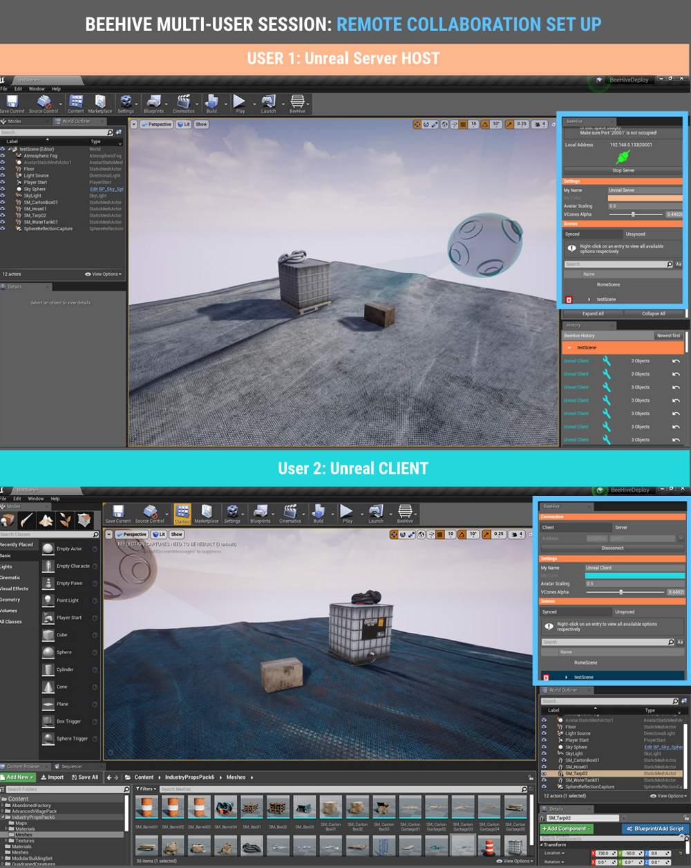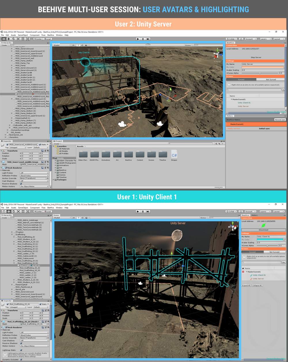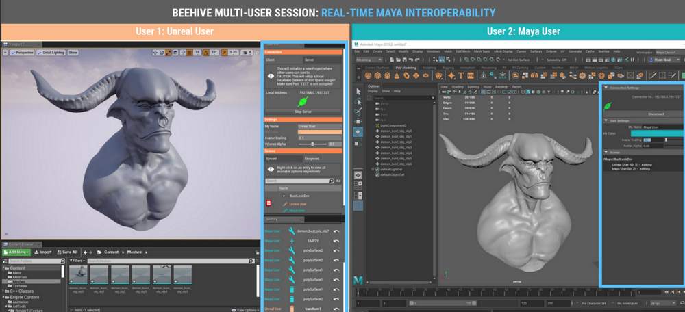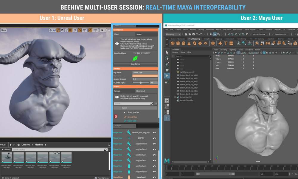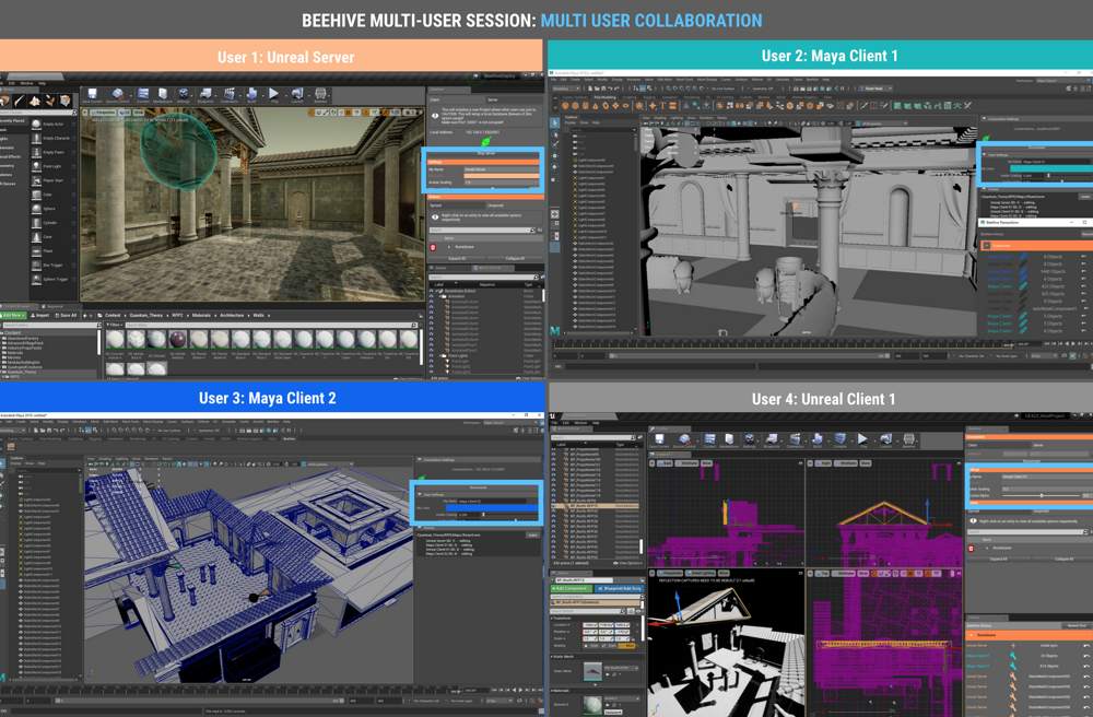 BeeHive is a cross-platform software solution built to enable collaborative, real-time workflows between Unreal Engine, Unity 3D and Autodesk Maya. It removes the inefficiencies of manual import and export, allowing directors, cinematographers and artists to sync, edit and review cameras, assets and virtual scenes from multiple applications at the same time and from any location. For instance, a supervisor can work inside of Unreal Engine or Unity 3D, alongside a connected Maya artist, to review and modify assets, troubleshoot lighting and FX, check actors’ faces and body performances, modify scenes, even build entire worlds from scratch for virtual reality (VR) experiences… and each user can see any change reflected instantly in each platform.