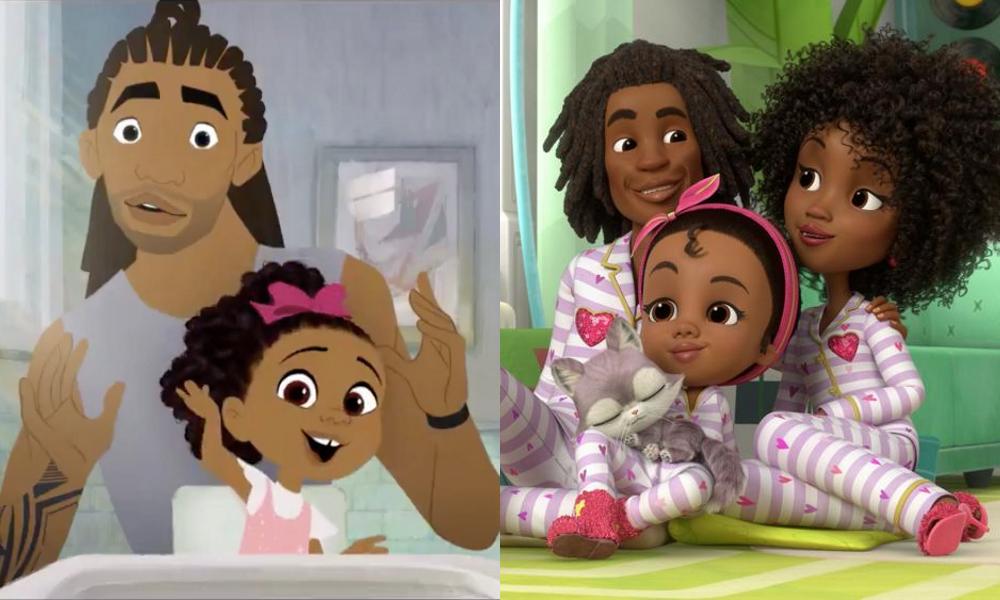 While the short and upcoming Young Love series are thematically different from the Nick Jr. series, which is created by kids’ content veteran Paula Rosenthal and produced by Silvergate Media (The Octonauts, Sunny Day), the characters bear striking similarities. Both families comprise a little daughter wearing her hair in an updo with a pink accessory, a mom with natural curls and a dad with dreadlocks. There are small differences (for example, Hair Love‘s Zuri wears a bow, Maddie wears a tied headband), but even Cherry raised a virtual eyebrow at Maddie’s grey-and-white cat.
