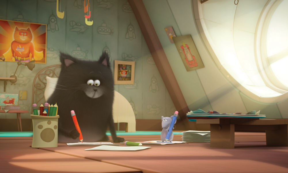 The show’s director Jean Duval, who has worked on numerous hit animated shows such as a Goof Troop, Darkwing Duck, TaleSpin, Babar and Mini Ninjas, says the visual inspirations for the project derived from Scotton’s books. “From furry cats (and mouse) to twisted furniture, from lollipop trees to duck sculptures popping up everywhere, it’s all there,” he notes. “However, as Splat & Seymour‘s environment is not precisely depicted in the books, we had to create entirely Splat’s town Moggy Bottom from scratch, while remaining true to Rob’s spirit but adapted to animation storytelling. Our main animation goal was to create a cute and believable friendship between a cat and a mouse. Whether it’s funny or a little bit scary or full of excitement, our storytelling is all about emotions!“