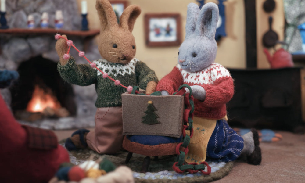 The film was completed over the course of three months in Love’s home studio. “Merry Christmas, Happy New Year” combines Love’s touchably soft wool fiber aesthetic with illustrator Wahl’s whimsical, folksy designs to create seasonal magic. Of course, there were a few tricky bits to contend with.