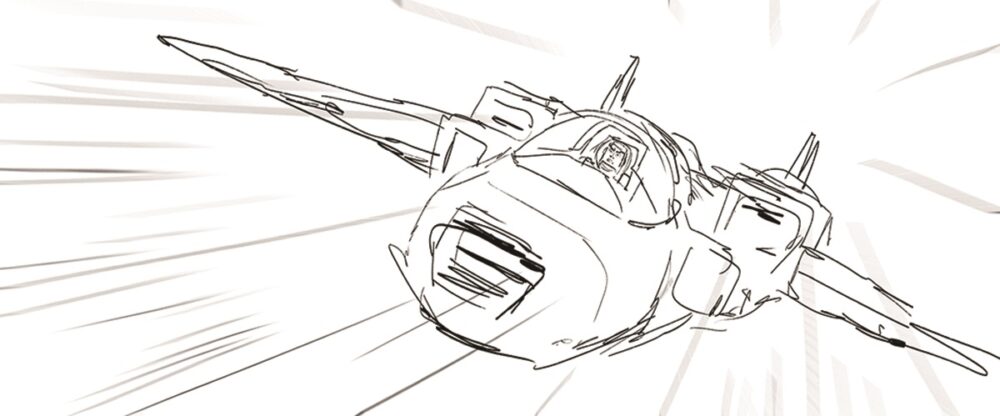 The film’s visuals depict a push-button world of inefficiency — and what MacLane describes as “a celebration of early 1970s and 1980s vision of the future.” The design team experimented with a variety of shapes and textures to explore the design possibility of a neo-retro future. “These early exploration sketches inspired us to settle on a clear design ethos: a rugged military aerospace design, combined with the 1980s consumer electronics aesthetic,” says the director. “This design language informed everything in the film, from the-the ground vehicles to the spaceships, you know, to all the sets. They all got the same treatment.”