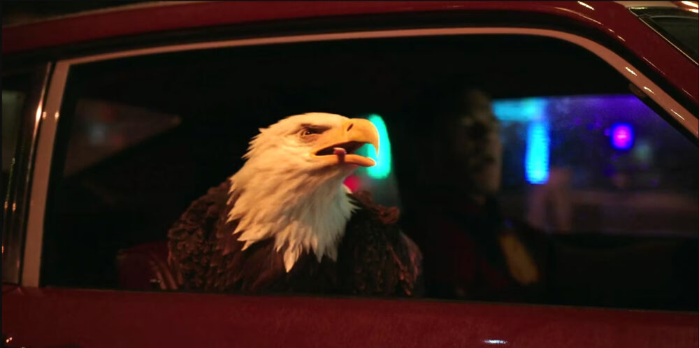 We also looked at dogs hanging out of windows with their tongues hanging out, and we used that for a similar scene with Eagly! We had to research how long an eagle’s tongue was and how do you expect it to flap outside. We probably stretched the truth a little bit, but it was the correct length. It was shot in Vancouver in a specific street, and to get our lighting right, we Google Mapped that location and then we mapped our lights according to that map.