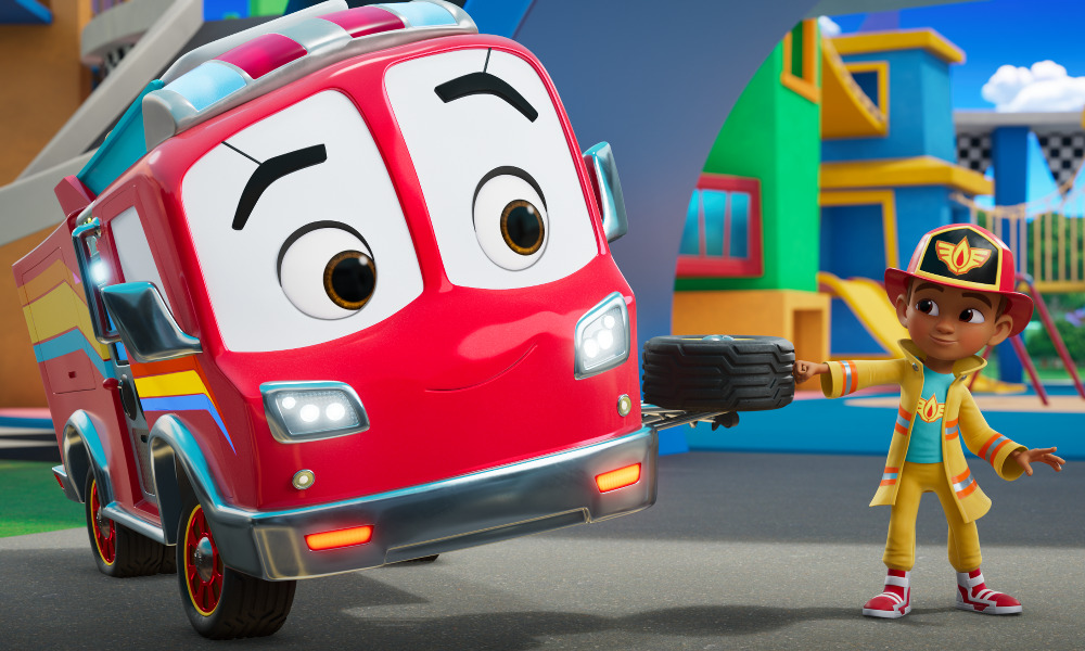 “It’s been a huge design challenge, to be honest, to create a world where we’re a tiny little kid and a giant fire truck can actually be in the same room together,” says Gerber. “We have a great design team and when you get to give the designers and the artists that challenge to create a new world, that’s half the fun. To have the windshield wipers (of the fire trucks) be the eyebrows was really a special moment for me because it helped create that eye frame and make the fire trucks really feel like characters.”