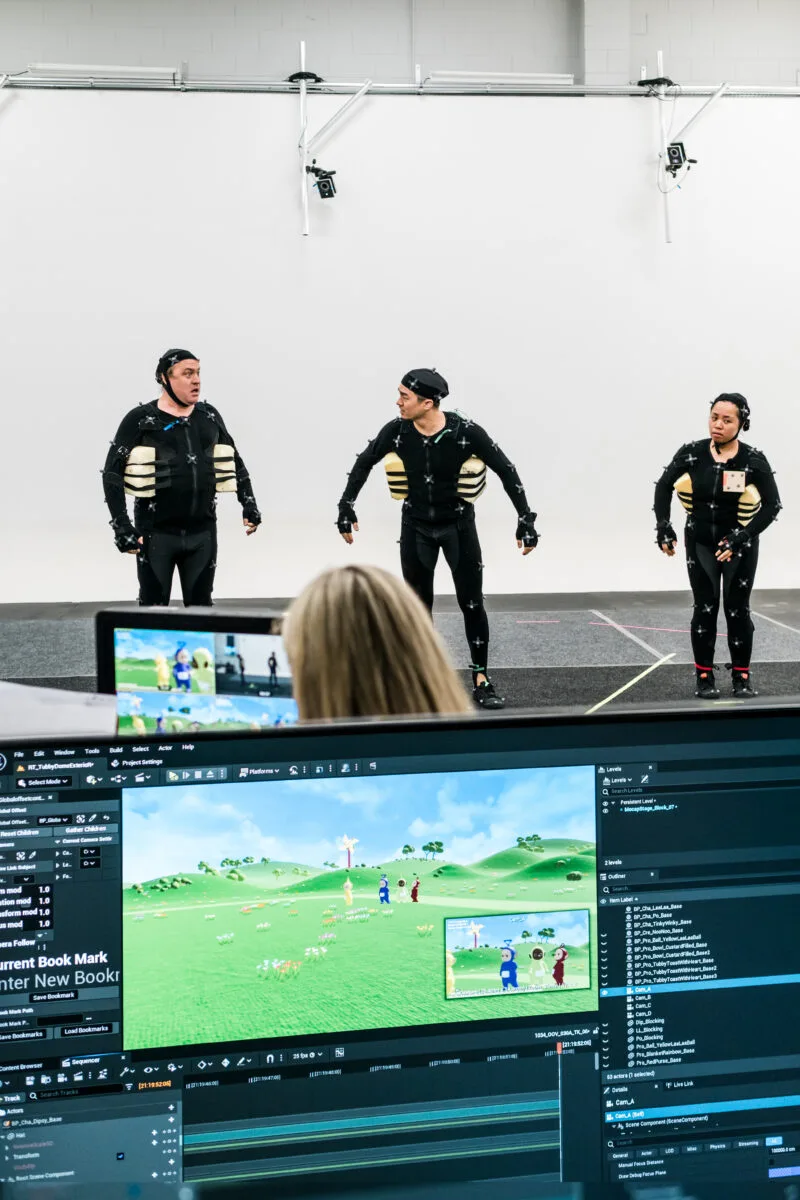 We’ve worked closely with the team at Fika Entertainment to build out this show. Their capabilities in motion capture and the progressive technology they’re developing give us such an exciting opportunity to combine creative and production expertise. We hold parallel rehearsals with the actors and animatics before jumping to stage, which lets us note shots and performances. Then, when on stage, we can watch the live motion-capture data in Unreal Engine as the almost final Teletubbies using the pipeline developed by Fika in-house. Due to the live-action origins of the original series, motion capture is the perfect process for a new animated version of the Teletubbies, and the technology we used here has pushed the boundaries of what’s possible, allowing us to retain the essence of the original coupled with cutting-edge animation techniques.
