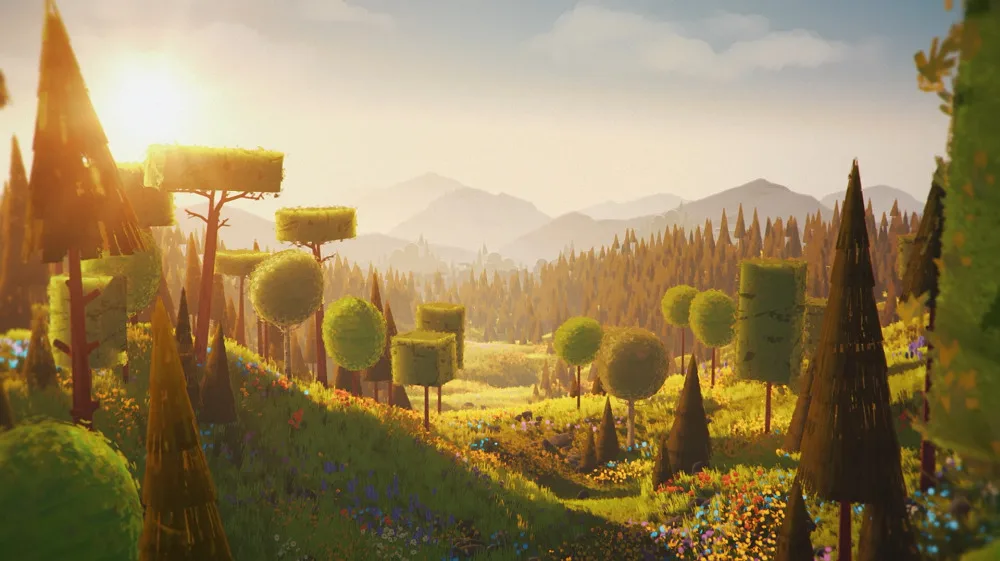 Horhager and Hong envisioned a short film with a children’s book-like aesthetic, featuring a forest filled with trees of multiple colors and geometric shapes. They wanted to utilize filmmaking techniques that have traditionally been the province of live-action projects, including elements like final framing and cinematography. To have that freedom to experiment, the duo needed to be able to explore a complete digital environment from any angle, in real time. That meant using a game engine, which led the duo to E.D. Films, experts in adapting distinct animation properties and one of the first animation studios in the world to have received an Epic MegaGrant.