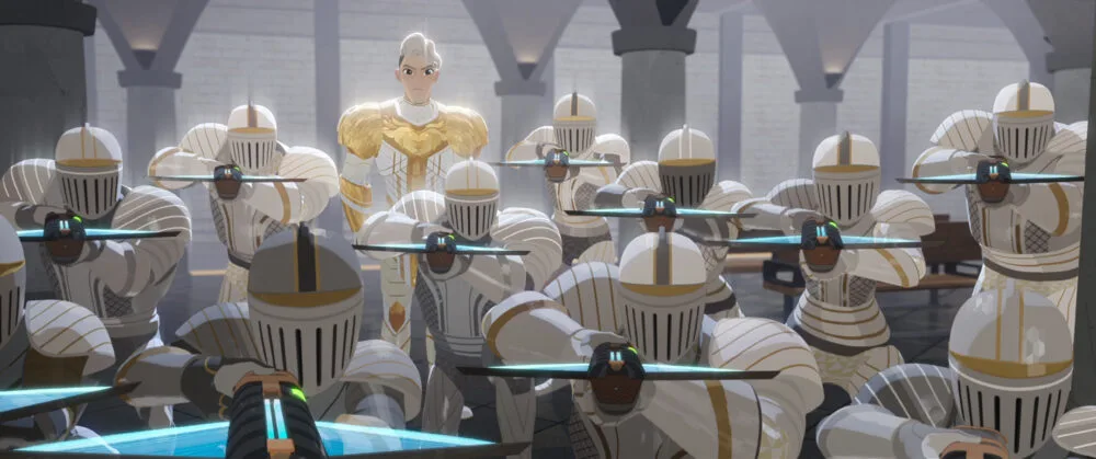 It’s hard not to notice that the aesthetics of Nimona do have their feet straddled between a classical 2D Disney sheen and a more modern 3D appeal in its depiction of environments that artfully blend 21st century technology with a traditional medieval city.