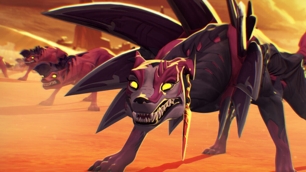 “The story explores the physical and metaphysical transformation of Naafiri. In League lore, she was a Darkin assassin who became entombed in a dagger. Eons later, she is discovered in the Shuriman desert by a lone explorer. This sets off a series of events that will ultimately lead to her inhabiting not one single entity but an entire pack of Dune Hounds. We take the audience through that abstract idea of the mind splitting to control the many and revealing the character’s final form back at the spot that started it all.”