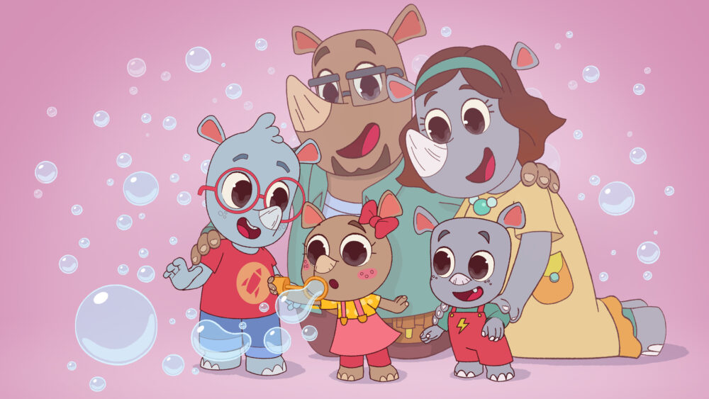 A new animated series about a family of rhinos is ready to teach children how to control their emotions. This charming new show, Stomp! Stomp! Rhinos! is produced by Lithuanian studio OAK9 Entertainment and will be making a splash at the MIPJunior and MIPCOM markets this month. The 13 x 7-minute series centers on the Rhino family (mom, dad and their three kids who live in a cozy home with their pet tortoise, Bobo) as they navigate life’s little challenges and learn how to manage emotions such as anger, frustration, jealousy, loneliness, etc.
