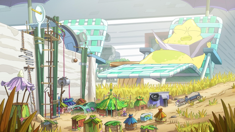 In the featurette, “Settling the Score,” series composer Chris Westlake discusses the musical detours taken for the show’s internal, ongoing story of “The Wall” — the dystopian habitat for shrunken humans hidden in junior aliens Jessie and Yumulack’s bedroom. Now that the unhappy denizens of The Wall have found their way into the Solars’ backyard, the score has taken on Western elements (including whipcracks!) to reflect the frontier spirit of their new settlement.