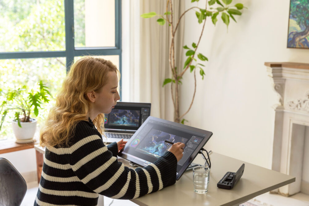 The Kamvas Pro 19 is designed with portability in mind. Weighing just four pounds and constructed from durable aluminum alloy, this tablet is perfect for artists who want to create anywhere. The built-in 20° stand enhances ergonomic comfort, while the versatile USB-C connection simplifies setup with desktops, PCs, or Macs.
