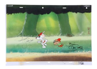 TV animation highlights include a standout cel and background setup from The Simpsons (1989 -present), depicting Bart cornered by Santa’s Little Helper. Signed by Nancy Cartwright, the voice of Bart, the lot features a rare hand-painted background on cel, rather than paper — an unusual technique that adds to its value and appeal. Estimated at £1,500 – £3,000 ($1,950 – $3,900).