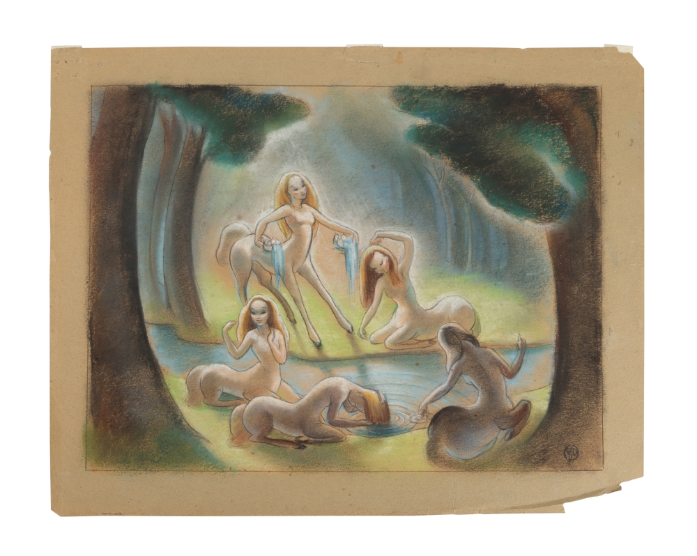 Also featured are a dynamic flying pose of Peter Pan from the much-loved 1953 film, a delicate and expressive cel of the Blue Fairy from Pinocchio (1940) and, from Fantasia (1940) two standout pieces: a model cel of Mickey Mouse in his “Sorcerer’s Apprentice” role (estimated at £2,000 – £4,000 ($2,600 – $5,200) and rare pre-release concept art of the centaurettes from “The Pastoral Symphony,” estimated at £3,000 – £6,000 ($3,750 – $7,500).