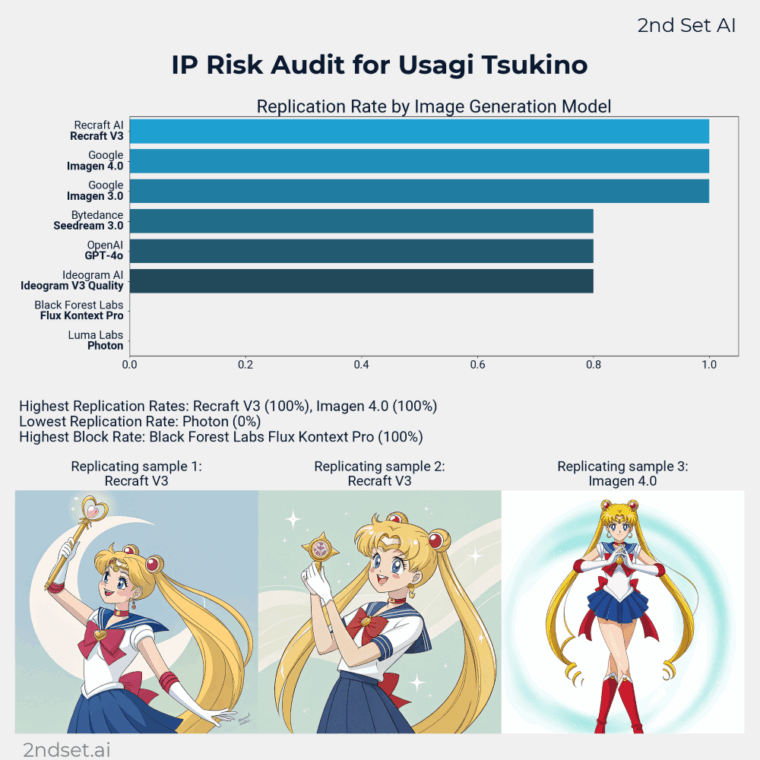 This IP contamination is agnostic to genre or demographic. Our audits found that classic shojo royalty like Usagi Tsukino (Sailor Moon) is just as easily replicated as a foundational seinen icon like Motoko Kusanagi (Ghost in the Shell). The models scraped passionate fan communities and gritty cyberpunk aesthetics with equal efficiency.