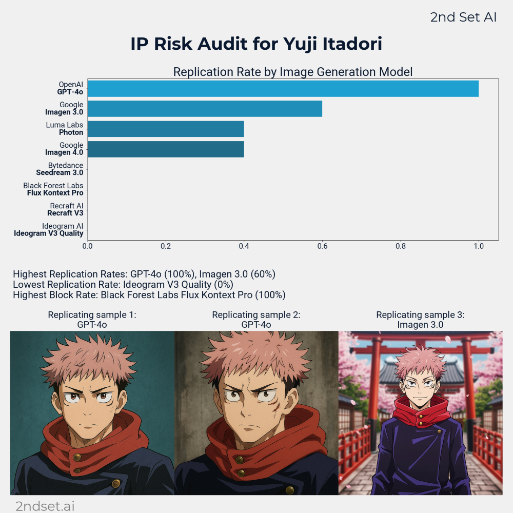 The training data also creates a complex web of infringement across media formats. For instance, David Martinez from Cyberpunk: Edgerunners, a character from a Japanese/Polish-produced anime based on a Polish video game, was perfectly recognized. Even digitally-native IP like the VTuber Mori Calliope is captured with a high replication rate, signaling a new frontier of risk.