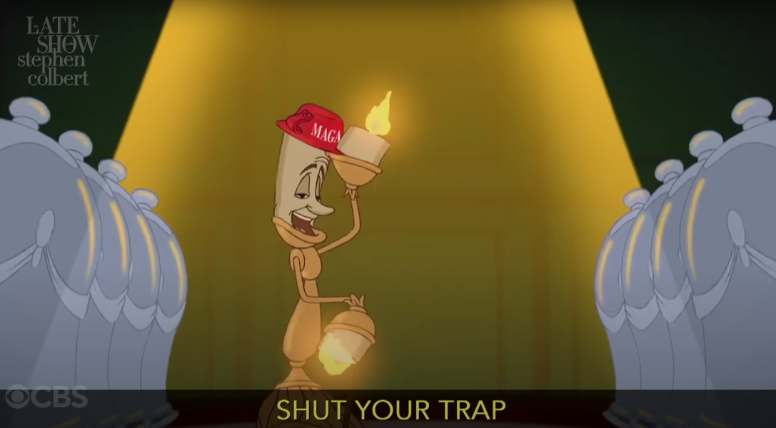CBS’s The Late Show with Stephen Colbert created a rapidly turned around cold open featuring a recreation of Lumière, the talking candelabra from Disney’s 1991 classic Beauty and the Beast (voiced by Jerry Orbach in the movie), performing a parody of the film’s Oscar-nominated original song “Be Our Guest.”