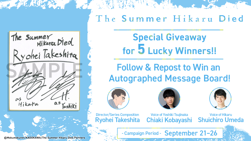 The creative team behind the supernatural anime series The Summer Hikaru Died are celebrating fans this week, launching a giveaway campaign on X that will reward five lucky winners with message boards autographed by key creative team members. Signatures include: