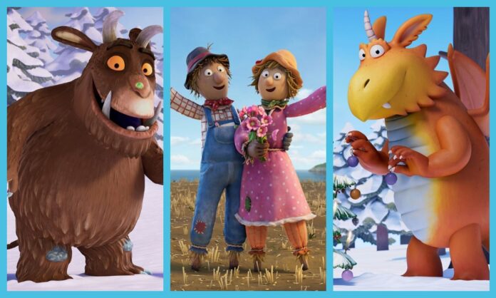 This year’s upcoming animated special, The Scarecrow’s Wedding is spotlighted with an ident starring lead characters Harry O’Hay and Betty O’Barley who receive a Christmas visit from Santa. Zog, Pearl and Gadabout from Zog and the Flying Doctors and Witch from Room on the Broom; while the third features The Gruffalo and The Gruffalo’s Child with Stick Man and his family.
